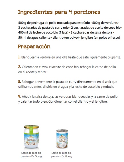Prueba nuestro delicioso curry tailandés de pollo preparado con nuestro aceite de coco virgen extra y leche de coco bio.