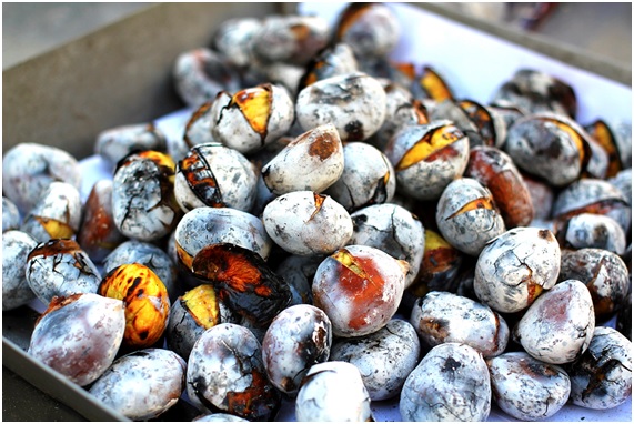 Tras la polinización, las flores femeninas se convierten en frutos con envolturas espinosas, que encierran de 2 a 3 granos comestibles, de color marrón oscuro con corteza brillante, que pesan de 8 a 12 g dependiendo de la especie. En su interior, su núcleo dulce y almidonado presenta una carne cremosa de color marrón más claro.