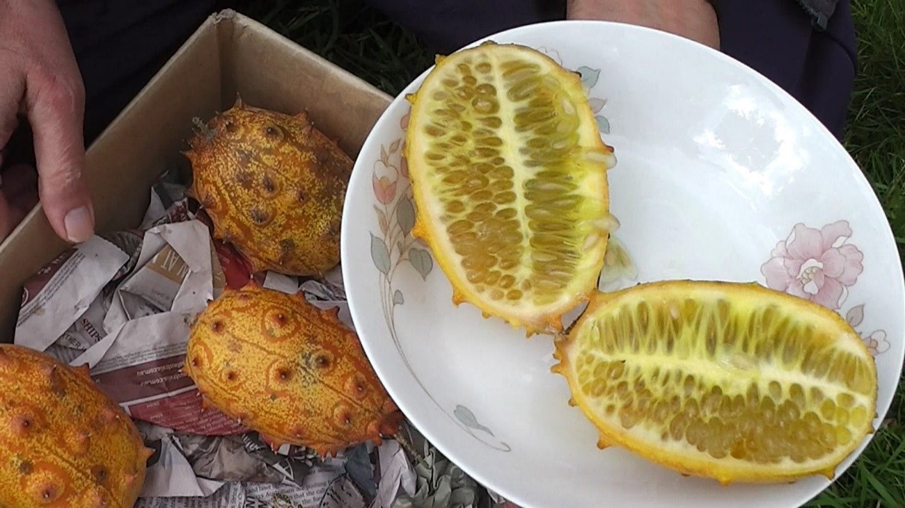 El pepino de cuernos africano (Cucumis metuliferus) es una de las frutas más antiguas del mundo, puesto que se originó hace 3000 años en África. Tiene una cáscara externa amarillenta con espinas como cuernos (muy rica en vitamina C) y su interior es una pulpa gelatinosa verde, con muchas semillas.