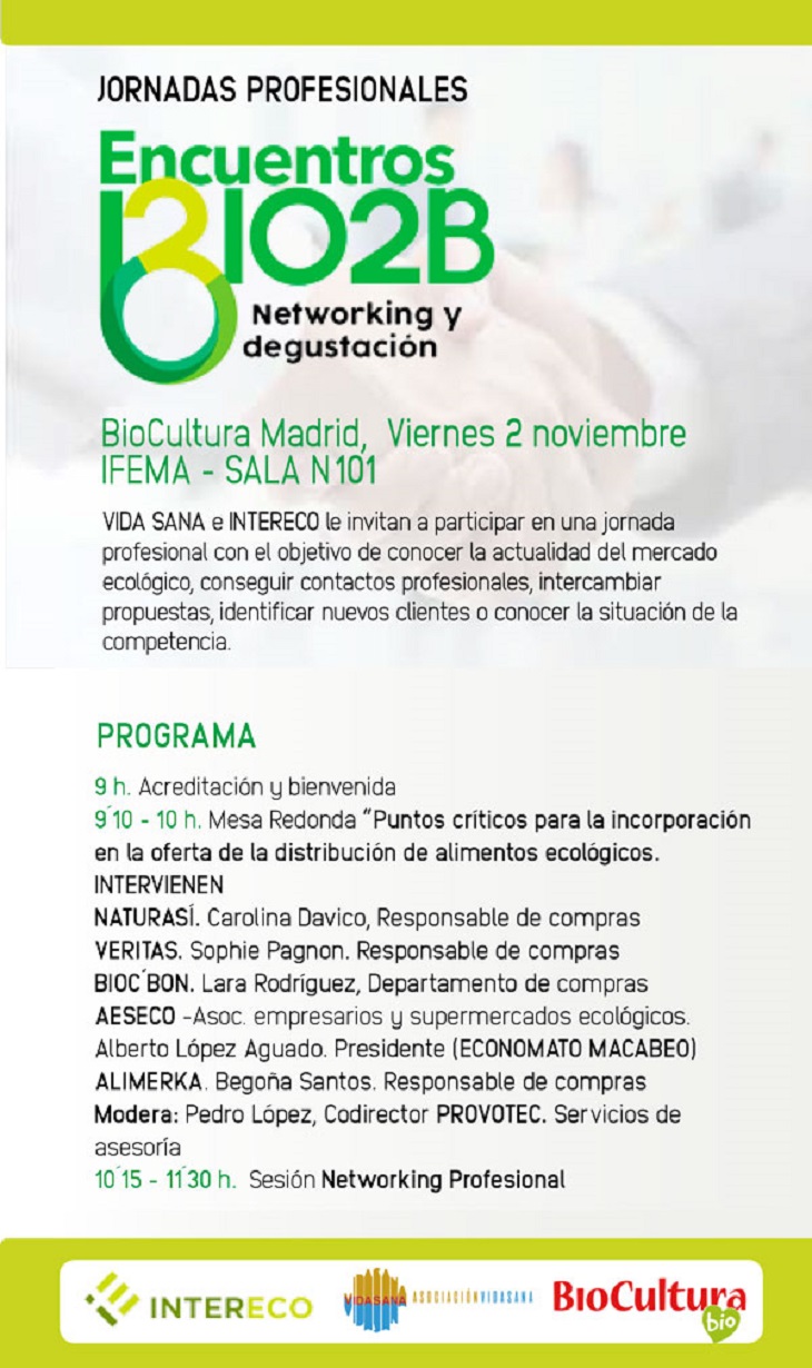 El encuentro se realizará el 2 de noviembre en BioCultura Madrid (Ifema) y contará con relevantes profesionales y empresarios del sector que participarán en una mesa redonda donde se debatirá y se compartirán conocimientos y experiencias bajo el tema: “Puntos críticos para la incorporación en la oferta de la distribución de alimentos ecológicos”.
