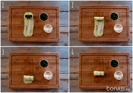 - Montaje: Cada caneloni se hace con dos tiras de calabacín. Colócalas superpuestas a lo largo. En la punta más cercana a ti, pon primero un poco de queso y encima un poquito del pesto y comienza a enrollar. Enrolla hasta llegar al final y reserva. Haz lo mismo con el resto.