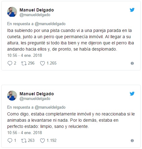 Hacerse el muerto es un truco que a muchos perros se les da bien. El truco es vistoso y hasta gracioso, si el contexto se da en un ambiente lúdico, evidentemente. De lo contrario, nos podríamos llevar un buen disgusto, como le pasó a Manuel Delgado, un madrileño aficionado a la bicicleta que se topó con una situación de lo más extraña y que terminó por popularizarse en Twitter. Y que, por supuesto, tiene como protagonista a un perro.