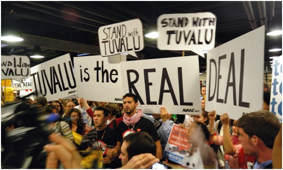 La nota la dieron primero el delegado de Tuvalu, un pequeño país insular de la Polinesia perteneciente al Commonwealth, que acusó a los demás de olvidarse que su territorio corría peligro de desaparecer bajo las aguas (tiene una altitud máxima de 5 metros sobre el nivel del mar) si continuaban los deshielos y el mar seguía subiendo.
