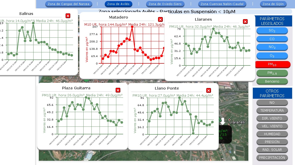 – En la estación de Oviedo ubicada en la Corredoria donde se llego a alcanzar picos de más de111µg/m3de PM10, la media de las últimas 24 horas fuera de66 µg/m3