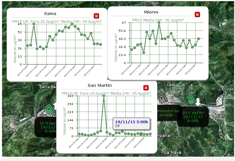 – En la estación de Mieres ubicada en el parque de Mieres donde se llego a alcanzar picos de más de67µg/m3de PM10, la media de las últimas 24 horas fuera de36µg/m3