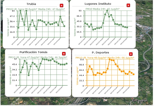 – En la estación de Castrillón ubicada en Salinas donde se llego a alcanzar picos de más de119µg/m3de PM10, la media de las últimas 24 horas fuera de46 µg/m3