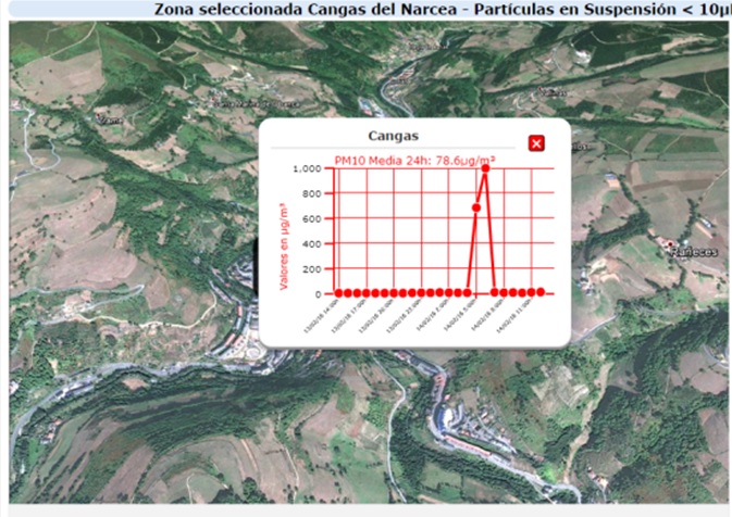 Hay que recordar que en los últimos meses, se han producido en Cangas 8 superaciones anormales de los valores de contaminación de partículas de menos de 10 micras, porque las de menos de 2,5 micras no se miden, sin que el Principado haya dado una explicación a este tema, solo dice que la estación esta averiada cada vez que se disparan los valores, lo que ya resulta mucha disculpa o muchas averías para esta estación en comparación con las del resto de Asturias.