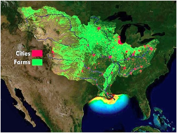 Tanto los científicos del gobierno como los independientes, creen que la causa principal es una reacción en cadena derivada de la escorrentía de nutrientes, que llegan a través de la cuenca del río Mississippi y sus afluentes, provenientes de 31 estados norteamericanos y dos provincias de Canadá.