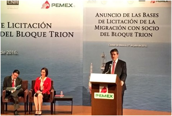 En junio de este año, Pemex dijo que había seleccionado el campo de Trion para la primera perforación en aguas profundas, ya que estima que tiene el equivalente a 485 millones de barriles de petróleo. Para el aporte de los 11 mil millones de dólares en inversión que se requieren para la exploración y explotación, anunciaron una licitación.