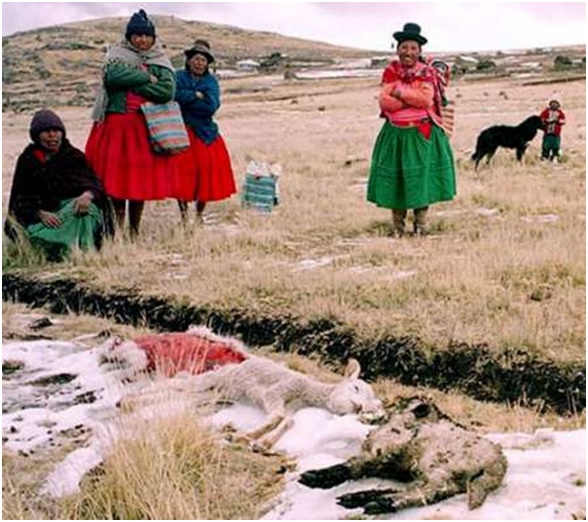 “Los investigadores estiman que la causa de la muerte masiva de alpacas en la zona de Ayacucho en Perú se debe a unas temperaturas inusualmente bajas y a la falta de alimentos, ya que el forraje que habitualmente consumen escasea por la intensa y persistente sequía.”