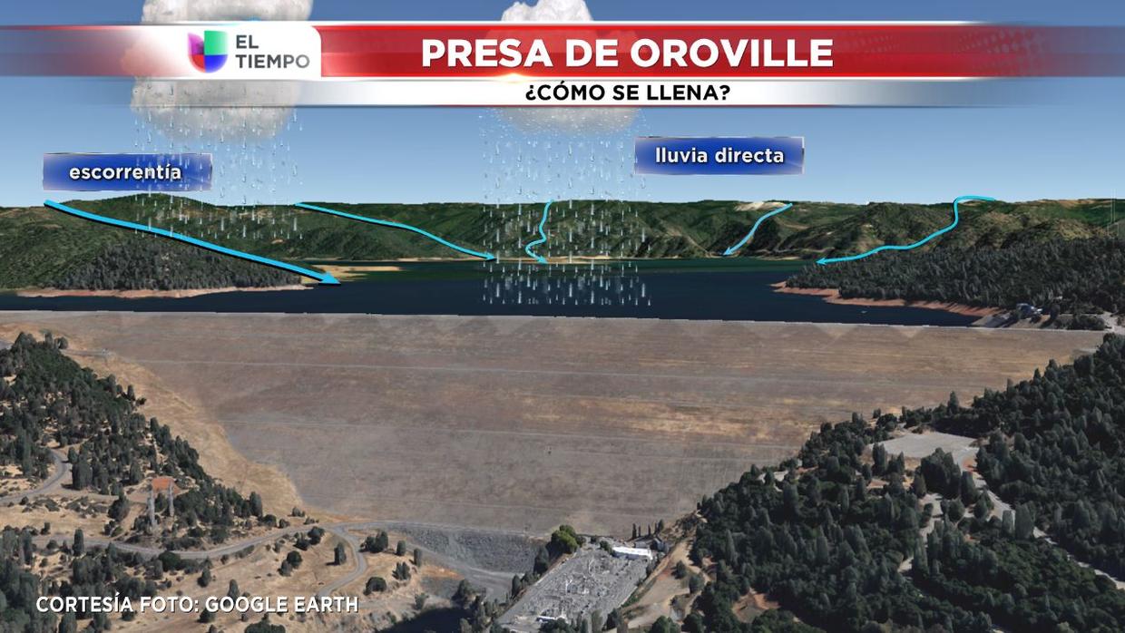 La geografía de la zona también representa un reto. En Orovile hay una ciudad, está el lago del mismo nombre y detrás, la cordillera. El lago no solo se llena solo con la lluvia que cae sobre él sino que cuando llueve sobre la montaña, el agua que se va colando por las laderas, cuestas y pendientes también favorecen la subida del nivel del agua.