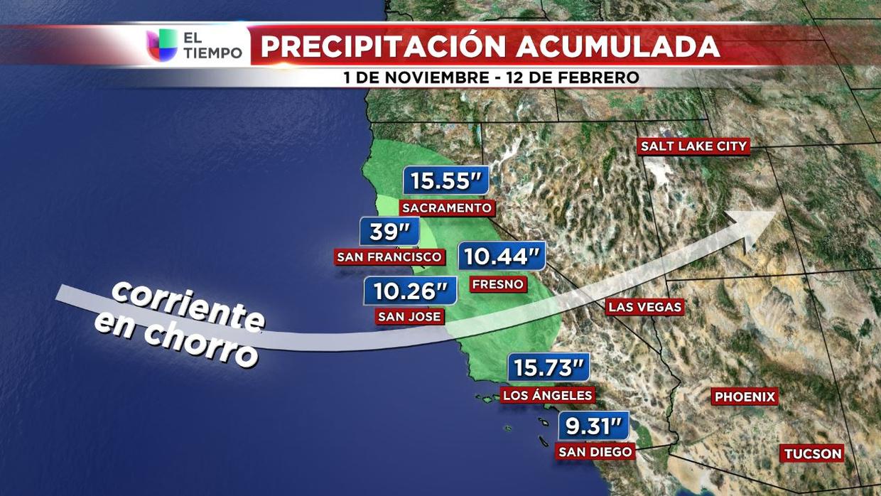 Es verdad que durante los últimos meses se han visto lluvias excepcionales sobre toda California. Entre el 1 de noviembre del año pasado y el 12 de febrero San Francisco acumula ya 39 pulgadas de lluvia, más del 50% de esa lluvia cayó solo durante el mes de enero del 2017. En Fresno los récords son de 10.44 pulgadas y en Sacramento de 9.85.