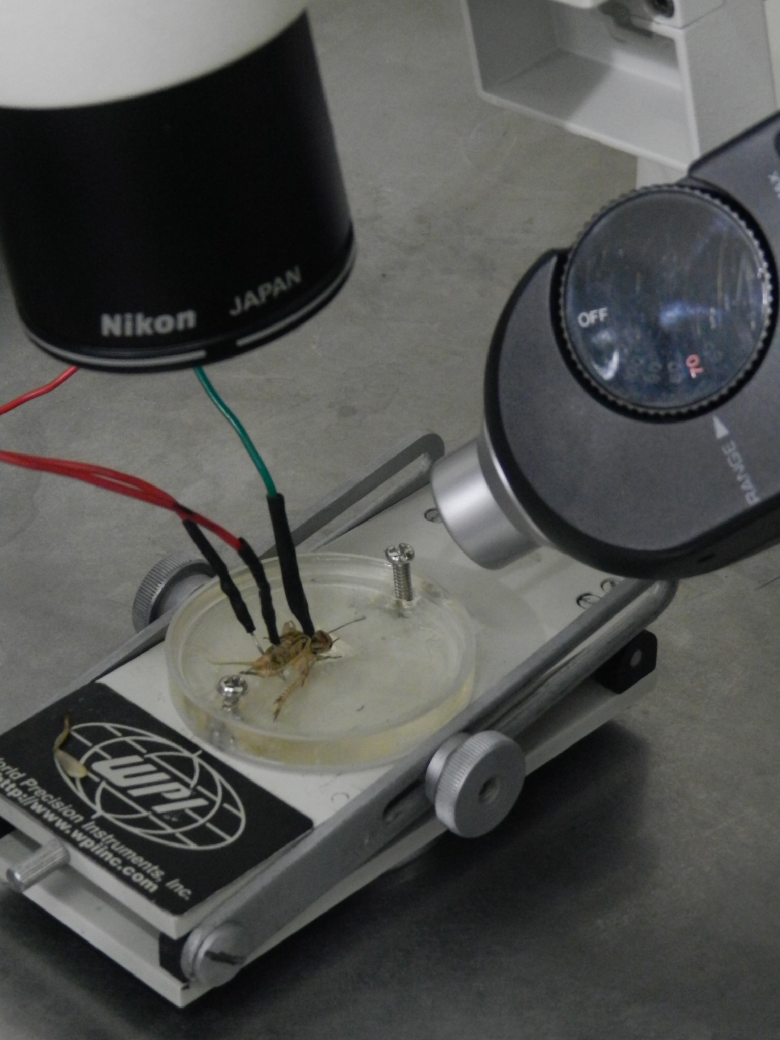 En el Laboratorio de Electrofisiología, estudiantes de biología, asesorados por el doctor Galicia Isasmendi, analizan el desarrollo sensorial auditivo en grillos por ser una especie poco analizada en México. En los grillos, explica el doctor Galicia, analizan un sistema conformado por cercos —apéndices localizados en la extremidad del abdomen del ortóptero con los que detectan vibraciones del sustrato— que pudieran servir de modelo para entender las propiedades de los sistemas auditivos en estos insectos.