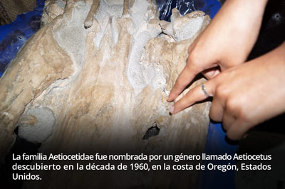 “Esta familia Aetiocetidae presenta dientes y en algunos ejemplares han encontrado los forámenes en donde estaba la barba y nervio que estaba alimentando; esta ballena tiene características, en el cráneo, diferentes a las de ballenas arcaicas descritas, el ejemplar es más grande y ancho y tiene otra pendiente en el rostro”, señaló Azucena Solís.