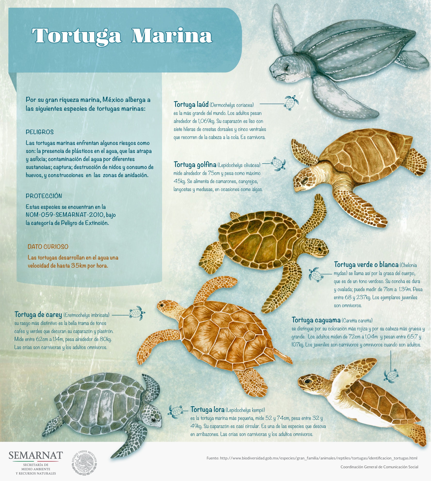 Uno de los espectáculos más hermosos que nos brinda la naturaleza es la arribazón de miles de tortugas que llegan a desovar a las costas de nuestro país. México recibe 6 de las 7 especies de tortugas marinas que existen en el mundo: caguama, lora, verde o prieta, golfina, laúd y carey. La única especie que no se encuentra en México es la tortuga Kikila o Australian Flatback Turtle.