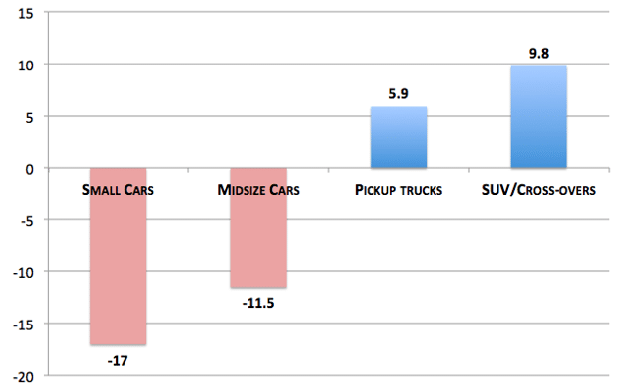 Cambio porcentual de ventas por tipo de vehículo, de enero a marzo de 2017.