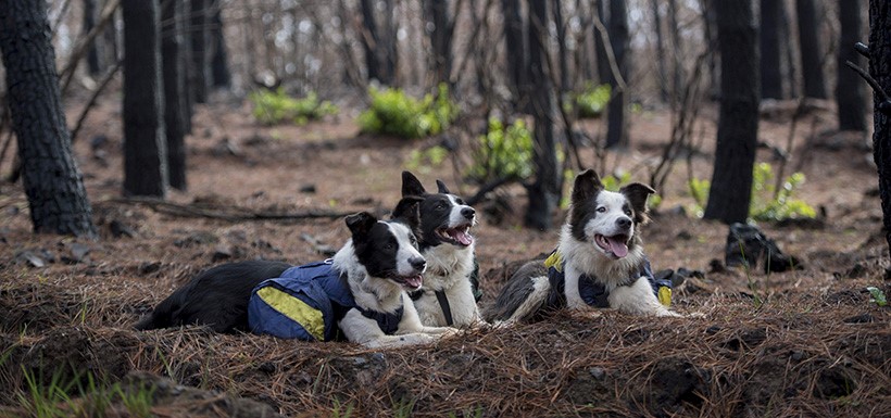 Pero desde el mes de marzo hay tres Border Collies que corren entre los restos calcinados llevando una cartera especial, que permite que semillas de diversas especies autóctonas sean esparcidas por los campos quemados.