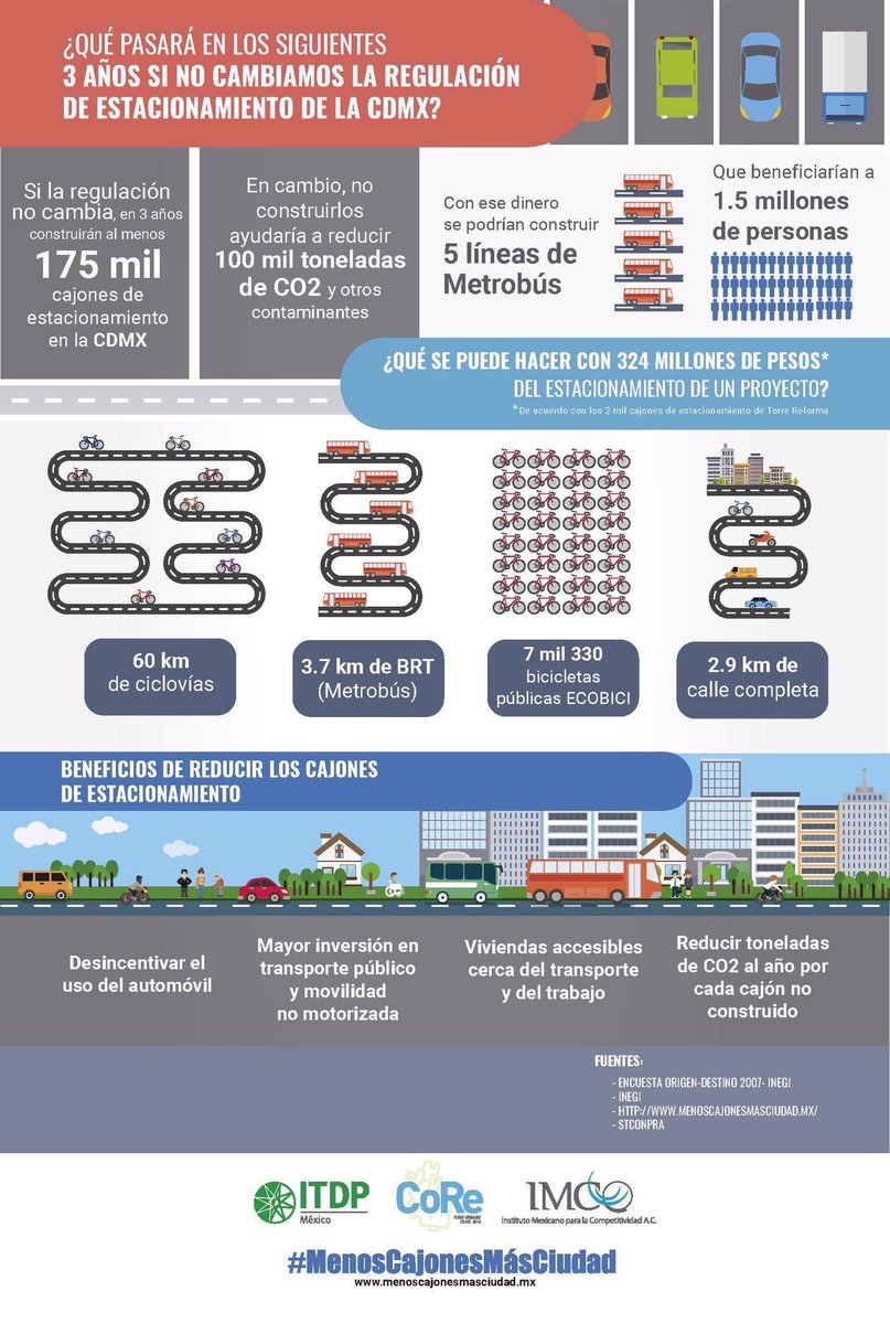 Esta iniciativa llega después de años de la campaña #MenosCajonesMasCiudad, la que ha tratado de mostrar la manera en que estos roban espacio vital para otros usos. Este trabajo contra el estacionamiento excesivo comenzó en 2014, cuando el ITDP publicó el estudio ‘Menos cajones, más ciudad’, con el financiamiento de la Embajada Británica, para explicar por qué era necesario actualizar la Norma Técnica Complementaria para el Proyecto Arquitectónico. Esta era una ley que provenía de los años 70 y mostraba una sobreestimación de la demanda actual de autos. Debido a esto, muchos estacionamientos quedaban vacíos. “Se imponía un mínimo de estacionamientos para cada proyecto nuevo en un mercado que no los requería”, explica Mario Quintanilla, investigador del ITDP. Los investigadores encontraron que, de 2009-2013, un 42% del desarrollo urbano se dedicaba a estos cajones para autos, lo cual es un obstáculo para una ciudad más sustentable, ya que promueve el uso del auto.
