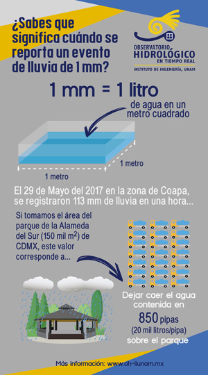 A través del Observatorio Hidrológico (OH) del Instituto de Ingeniería de la UNAM se ha desarrollado un sistema de alerta de lluvia en tiempo real que permite informar sobre los lugares donde llueve y la cantidad de agua que cae, con el objetivo de prevenir desastres que pueden ser causados por las precipitaciones y, de este modo, mantener a salvo a los ciudadanos.