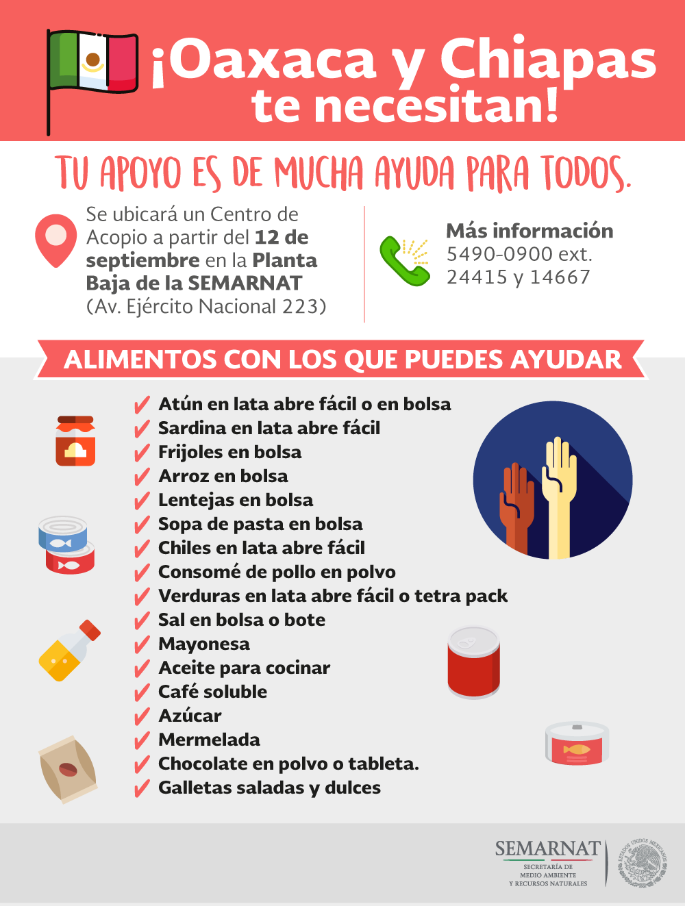 Con el fin de continuar con la ayuda a los damnificados, la SEMARNAT abrió un centro de acopio en sus instalaciones de la Ciudad de México, ubicadas en Av. Ejército Nacional 223, Col. Anáhuac, Delegación Miguel Hidalgo, donde se recibirán las donaciones solidarias en un horario de 9:00 a 18:00 hrs.