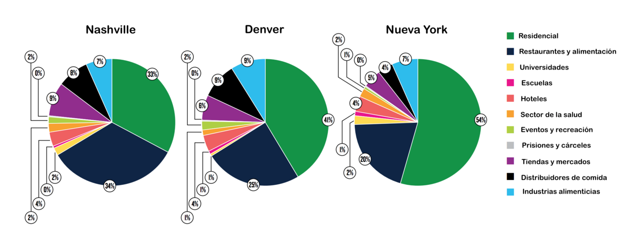 Sin embargo, a juzgar por los diarios de las cocinas, la mayoría de los alimentos desperdiciados no terminaron en los contenedores de abono: un 53% fue directo a la basura. En Nueva York, una ciudad que tiene un plan relativamente robusto para el abono de materiales orgánicos, un 37% de los alimentos desechados según los autoreportes terminaron en el contenedor del abono. En los casos de Denver y Nashville, esta cifra fue de un 24% y un 28%, respectivamente, aunque los encuestados en Denver reportaron el nivel más alto de participación en programas de abono.