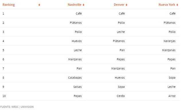 A lo largo de las tres ciudades, el café y las borras fueron los alimentos que se tiraban con mayor frecuencia, seguidos por bananas (en Nashville y en Nueva York) y pollo (en Denver). Las manzanas, el pan, las naranjas y las papas también encabezaron la lista, al igual que productos lácteos desechados.