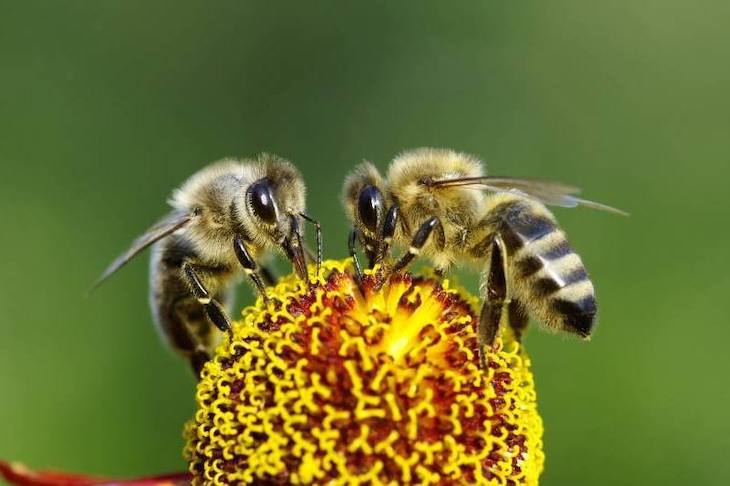 Se encuentran entre los principales polinizadores. De las numerosas especies de abeja que existen, la melífera o doméstica (Hymenoptera) es de las polinizadoras más eficientes. Herbívoras en general, las abejas dependen de las flores, ya que cosechan para sus larvas néctar, alimento altamente energético, y polen, rico en proteínas, por lo que están altamente adaptadas a la polinización y son atraídas por los aromas, colores y formas de las flores.