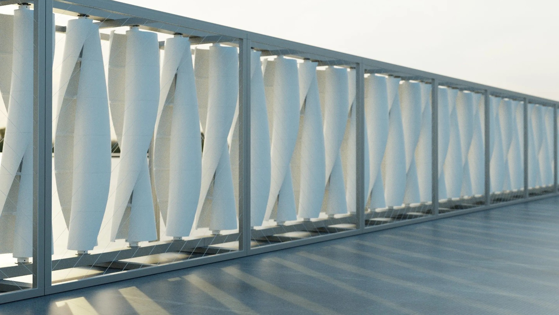 Airiva’s wind fence is therefore a perfect example of how form and function can be one and the same. It uses vertical wind turbines with a peculiar helical structure, which makes them look somewhat like strands of DNA or Italian fusilli pasta. These turbines are about two meters high, and their slim square ‘wall segments’ can hook together to form a fence of any length.