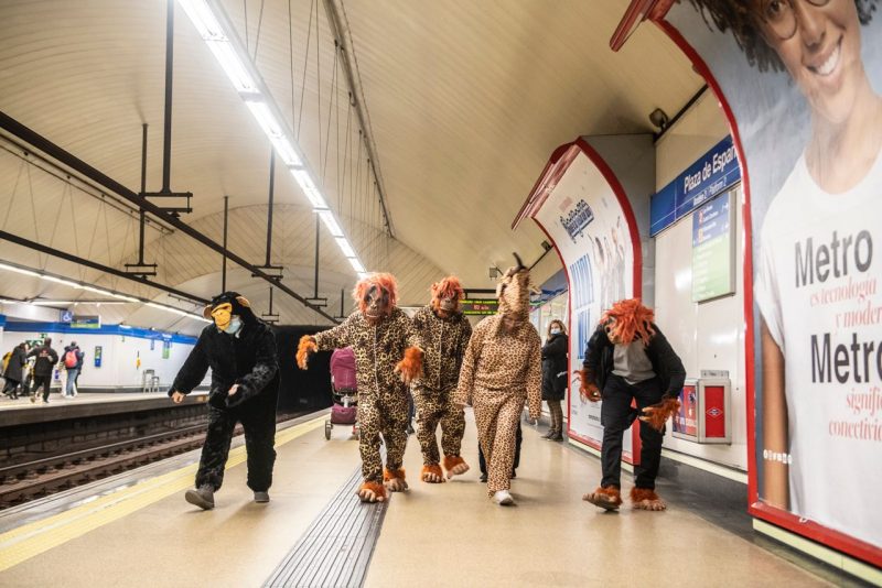 Orangutanes y jaguares en el Metro de Madrid. El 28 de diciembre fue un día especial en el Metro de Madrid. Ante las miradas atónitas de cientos de viajeras y viajeros, un grupo de orangutanes de Indonesia y jaguares de la Amazonia brasileña ha realizado un divertido y reivindicativo viaje en el suburbano madrileño.