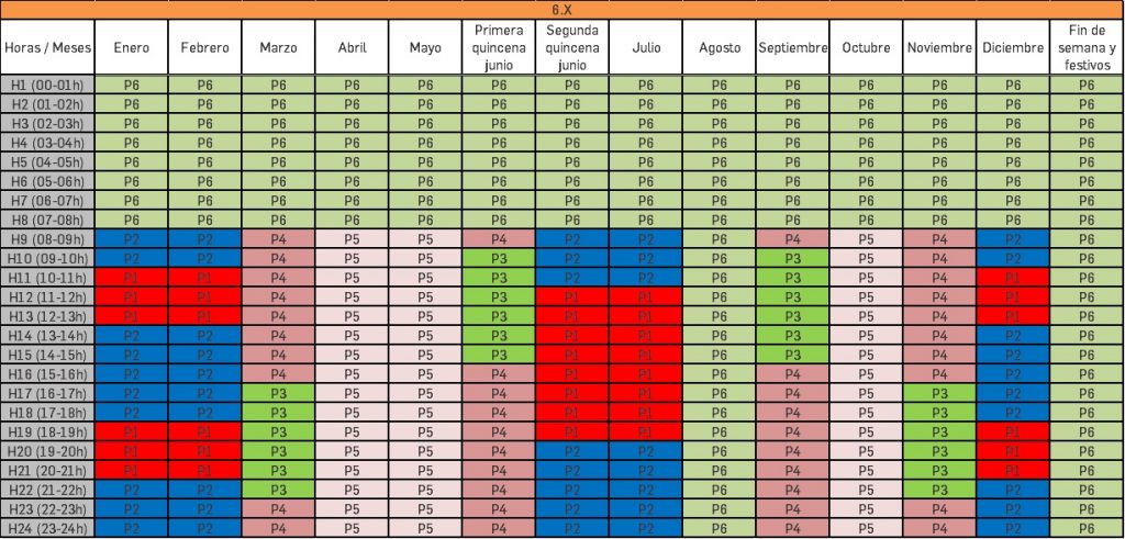 Como se puede ver en la siguiente imagen, el horario (para Península) de los periodos cambia de un mes a otro e, incluso, como sucede con el mes de junio, de una quincena a otra. Los días festivos son los mismos que para la tarifa 3.1 A, aquellos de ámbito nacional excluidos tanto los festivos sustituibles, como los que no tienen fecha fija.