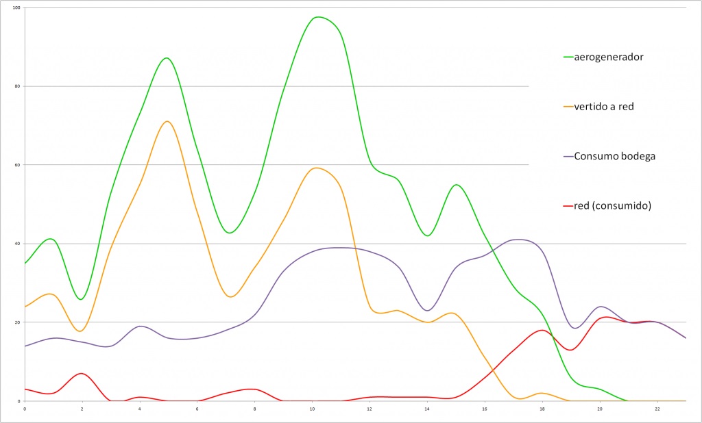 En la gráfica adjunta se puede comprobar un día de funcionamiento de la instalación típica, en la que puede verse cómo la bodega tiene unos consumos ajustados a sus turnos de mañana y tarde y cómo el aerogenerador sufre los cambios de velocidad de viento e incluso cómo a partir de las 7 de la tarde el recurso eólico es insuficiente para la producción eléctrica. También se puede apreciar cómo cuando la potencia generada supera los consumos de la bodega los excesos de potencia se vierten a red. En concreto el día mostrado es un día en el que el aerogenerador ha producido 1.060kWh, de los cuales 455kWh han sido autoconsumidos por la bodega y 605kWh vendidos a red, como cualquier otra fuente de generación.
