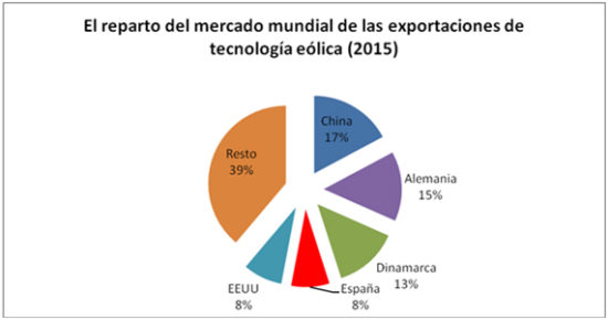 En 2016, España continuó siendo el tercer país del mundo en el ranking de países exportadores netos de tecnología eólica (si sólo se tienen en cuenta las exportaciones, sin restarles las importaciones, España estaría en cuarto lugar, detrás de Alemania. A diferencia de España, tiene que importar determinados componentes eólicos, mientras España cuenta con toda la cadena de valor).