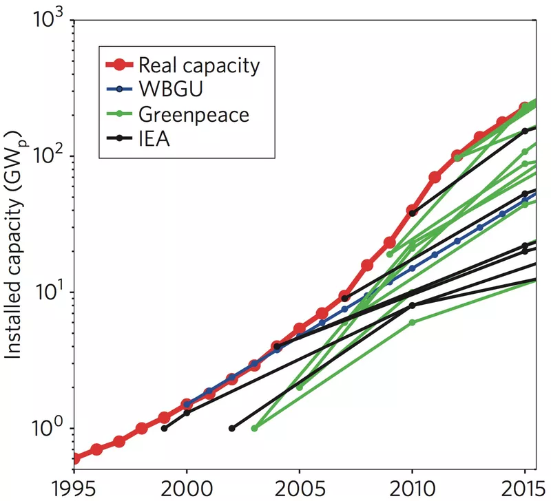En este gráfico, la línea roja representa la capacidad fotovoltaica mundial instalada. Las líneas negras son previsiones de la Agencia Internacional de Energía (AIE), la azul del Consejo Consultivo Alemán sobre Cambio Climático Global y las verdes son de Greenpeace. Sólo las proyecciones de Greenpeace han llegado cerca de la realidad y ello ha sucedido recientemente.