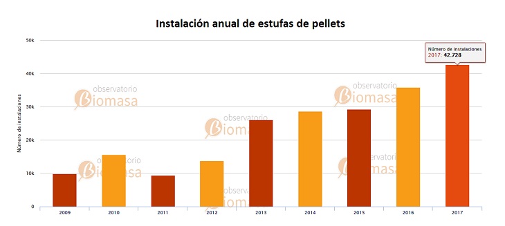 Según observatoriobiomasa.es, la utilización de la biomasa como combustible de calefacción se ha multiplicado por 25 en la última década, ya que en 2008 había menos de 9.600 instalaciones operativas en el país. Aunque el mayor crecimiento se ha registrado en los tres últimos años, en los que se ha duplicado prácticamente el número de equipos, al pasar de las 127.995 instalaciones que operaban a finales de 2014 hasta las 244.197 registradas al cierre de 2017.