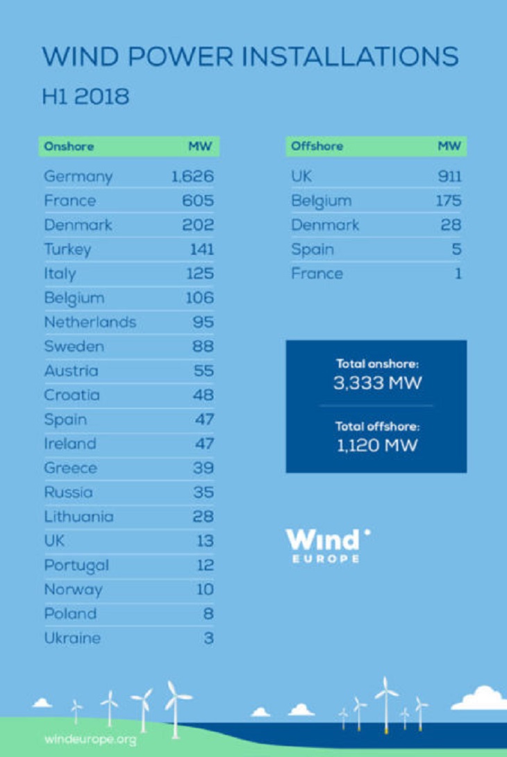 De los 4,5 GW nuevos que se han instalado, 3,3 GW corresponden a eólica terrestre liderados por Alemania que ha instalado 1,6 GW, Francia con 605 MW y Dinamarca con 202 MW, en cuanto a la eólica marina, la potencia instalada ha sido de 1,1 GW principalmente en Reino Unido con 911 MW, Bélgica (175 MW) y Dinamarca (28 MW). Alemania instalará nuevos megavatios de eólica offshore en la segunda mitad del año.