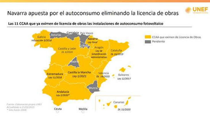 La Unión Española Fotovoltaica (UNEF) ha logrado que la Comunidad Autónoma de Navarra apruebe la adecuación de las leyes autonómicas de urbanismo a la realidad del autoconsumo, para que estas instalaciones se tramiten por la vía de la comunicación previa, lo que agiliza considerablemente la tramitación administrativa.