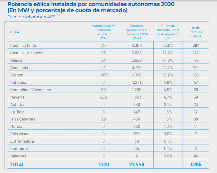 Además, la eólica funcionó una media de 2.042 horas equivalentes anuales y ha cubierto el 21,9% de la generación total a nivel nacional en 2020. Las comunidades autónomas con mayor potencia eólica instalada son Castilla y León (6.300 MW), Aragón (4.159 MW) y Castilla La Mancha (3.886 MW). En 2020, la comunidad autónoma de Castilla y León ha sido la que más electricidad ha generado con el viento, seguida de Galicia y Aragón.