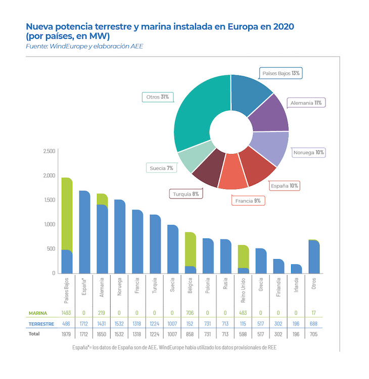 En Europa, en 2020 la potencia total instalada fue de 14,7 GW. La nueva potencia ha estado liderada por Países Bajos, Alemania, Noruega y España. Por su parte, España continúa siendo el segundo país europeo y el quinto mundial con más potencia instalada acumulada. De esos 14,7 GW de nueva potencia en 2020, 2,9 GW han sido de instalación offshore en aguas europeas. Con esta nueva potencia, la capacidad total instalada de eólica marina en el continente asciende a 25 GW.