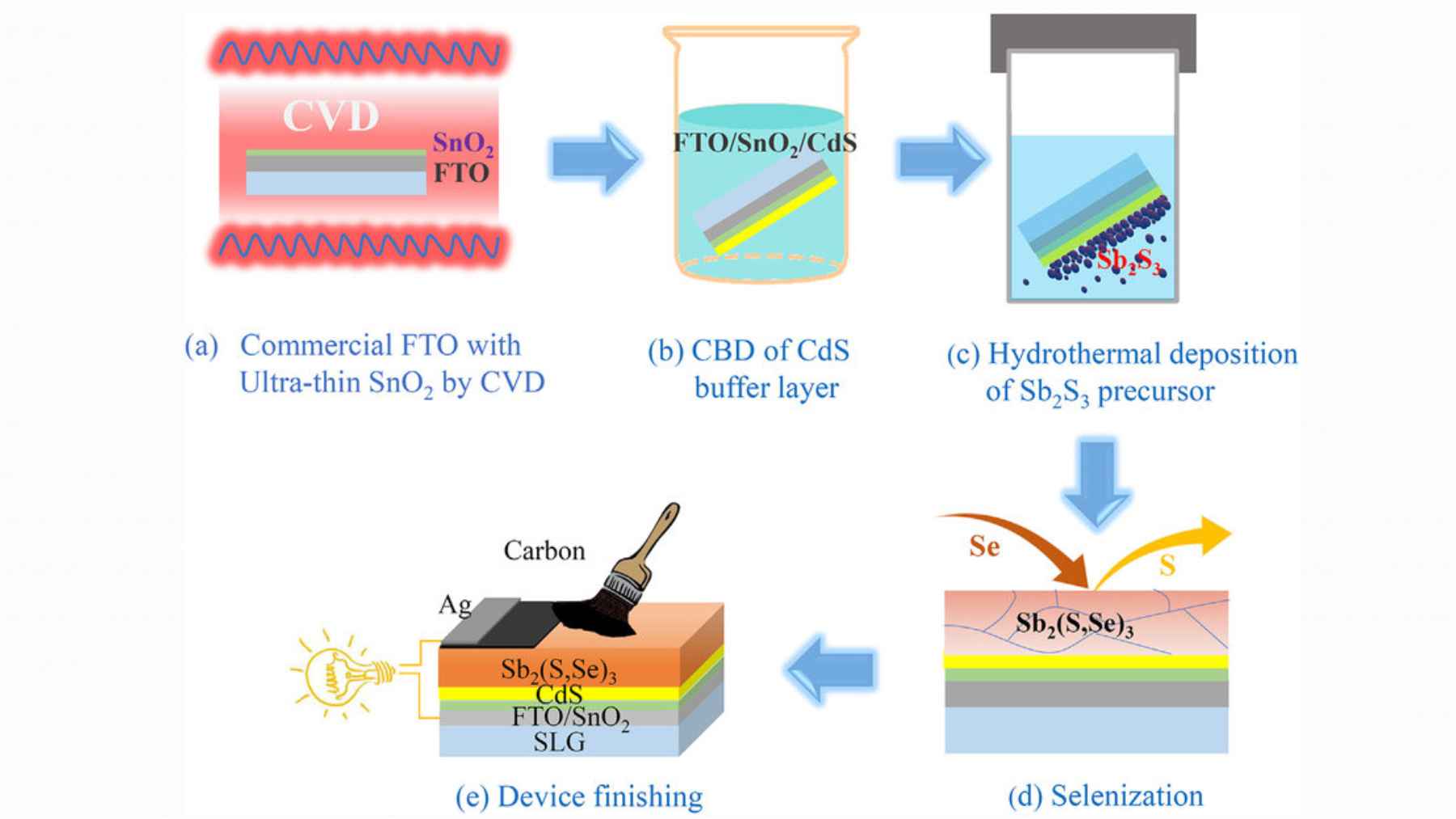 La novedad del estudio está en un ajuste fino de la química. El equipo ha introducido una pequeña cantidad de sulfuro de sodio en la solución precursora que se usa en la deposición hidrotermal, la técnica con la que se fabrica la película de Sb₂(S,Se)₃. Este aditivo amortigua el pH y ralentiza la reacción, de modo que el selenio se libera de manera más controlada y azufre y selenio se reparten con más uniformidad en toda la capa.