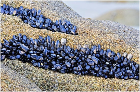 Los mejillones azules (Mytilus edulis) constituyen una población biológica importante en la zona intermareal del ecosistema del Mar de Wadden. Las camas de mejillón azul son estructuras biogénicas autóctonas.