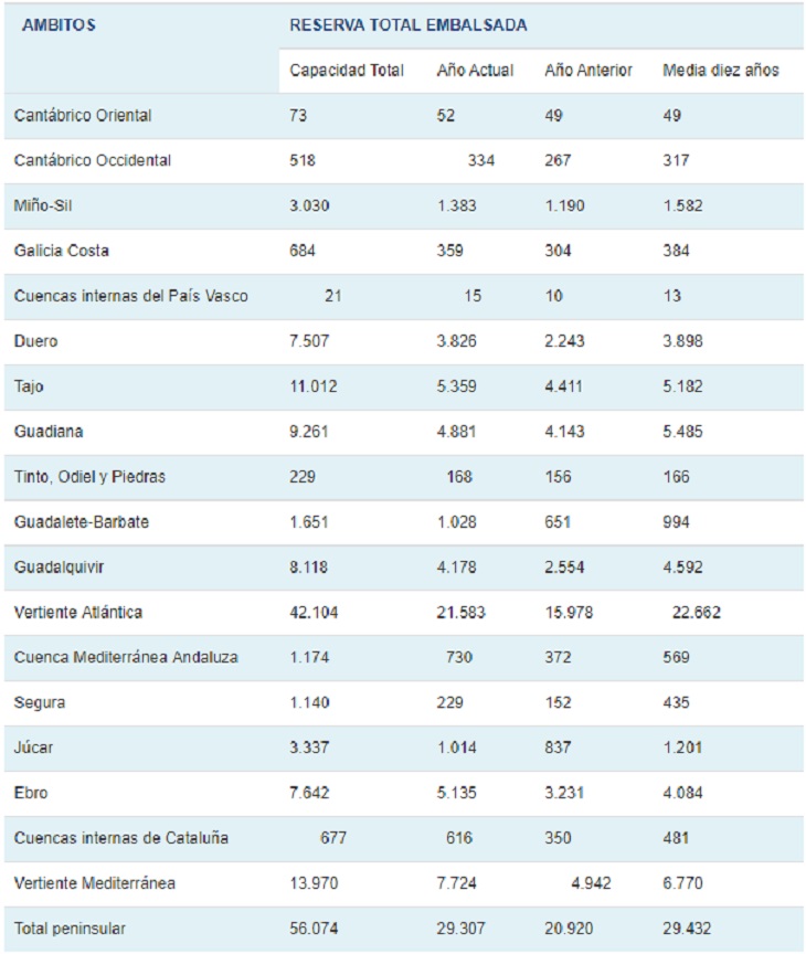 La reserva hidráulica española está al 52,3 por ciento de su capacidad total. Los embalses almacenan actualmente 29.307 hectómetros cúbicos (hm³) de agua, aumentando en la última semana en 121 hm³ (el 0,2% de la capacidad total de los embalses).