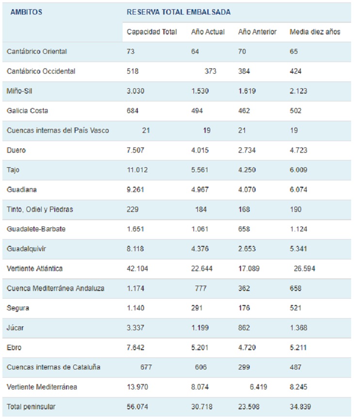 La reserva hidráulica española está al 54,7 por ciento de su capacidad total. Los embalses almacenan actualmente 30.718 hectómetros cúbicos (hm³) de agua, aumentando en la última semana en 457 hm³ (el 0,8% de la capacidad total de los embalses).