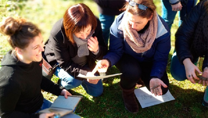Las maestras de la Escuela Peramàs mirando texturas y colores del suelo con la ayuda de Andrea Vidal