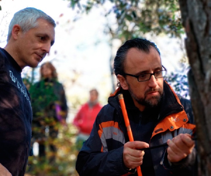 Con la ayuda de una barrena el director de la Escuela Peramàs (derecha) y José Luís (izquierda) sacan un testimonio de la corteza de un árbol.