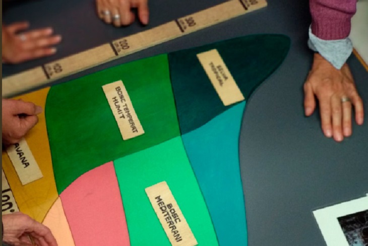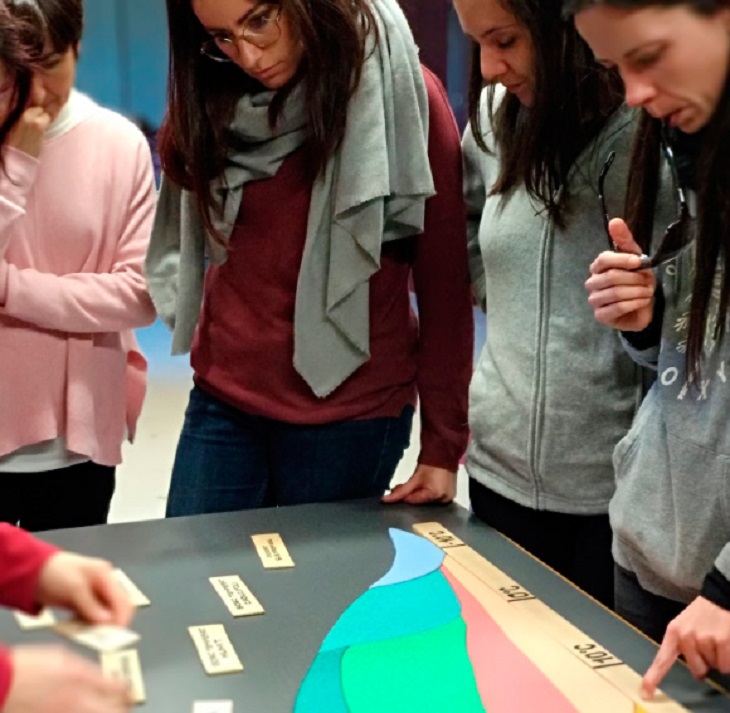 El tercer taller estaba enfocado a la escala más grande de todas: la escala planetaria. Mireia Banqué, Anabel Sánchez y Roberto Molowny, explicaron que los seres vivos del planeta se distribuyen por el territorio según dos condiciones muy importantes, la temperatura y la lluvia que cae. Esto da lugar a paisajes o grandes zonas que comparten un clima, una flora y una fauna característica y que en ecología se llaman biomas. Los maestros y maestras de la escuela Peramàs pudieron montar el puzzle de los biomas del mundo, discutir sobre cambio climático y tomar conciencia de que el territorio está cambiando a una velocidad de vértigo debido a la actividad humana.