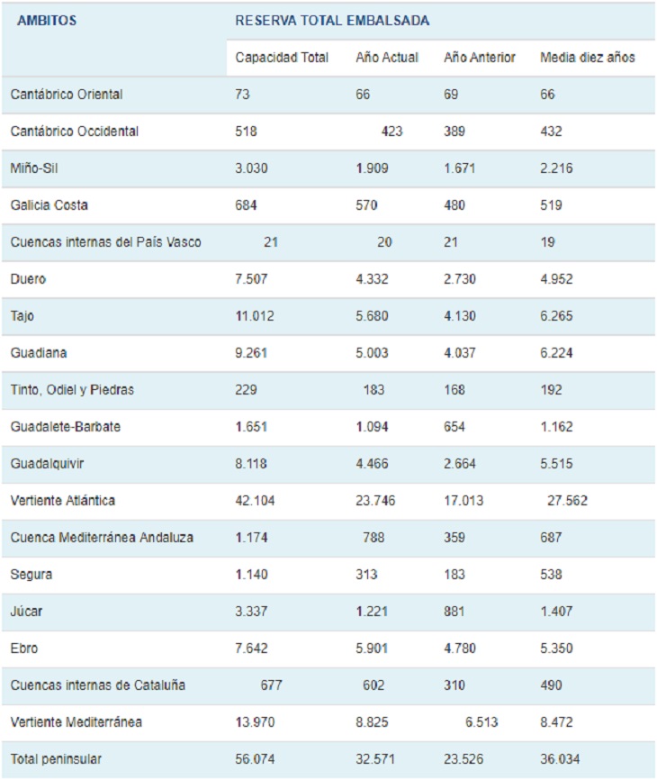 La reserva hidráulica española está al 58 por ciento de su capacidad total. Los embalses almacenan actualmente 32.571 hectómetros cúbicos (hm³) de agua, aumentando en la última semana en 589 hm³ (el 1,0% de la capacidad total de los embalses).