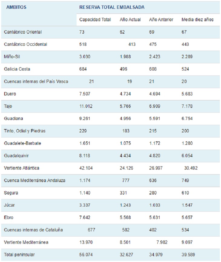 La situación de las cuencas, en hectómetros cúbicos, se detalla en el cuadro adjunto: