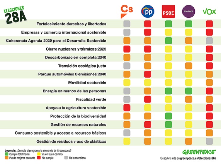 Greenpeace observa que las cuestiones medioambientales están cada vez más presentes en los programas electorales, pero que la transición ecológica está lejos de poder concretarse debido a la insuficiente ambición y concreción recogida en estos. Los programas de PSOE y Podemos son los que comprenden mejores propuestas medioambientales y en defensa de los derechos y libertades, mientras que Partido Popular y Vox suspenden en esta materia.
