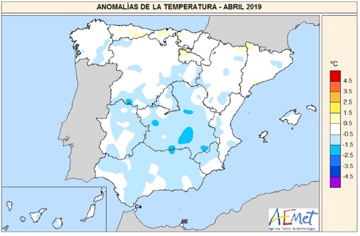 El mes de abril ha sido en su conjunto normal, con una temperatura media en España justamente coincidente con la media del mes, de 13,0º C para el periodo de referencia. De esta forma, abril de 2019 se convierte en el sexto abril más frío desde comienzo del siglo XXI.