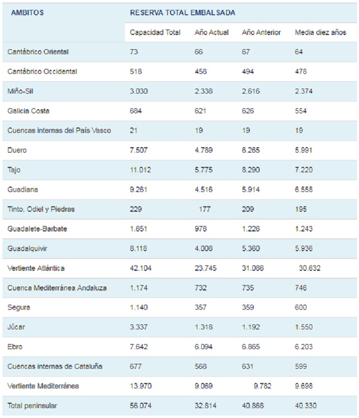 La reserva hidráulica española está al 58,5 por ciento de su capacidad total. Los embalses almacenan actualmente 32.814 hectómetros cúbicos (hm³) de agua, disminuyendo en la última semana en 457 hectómetros cúbicos (el 0,8 por ciento de la capacidad total actual de los embalses)